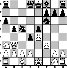 game notation in PGN-format [Event "Fr"] [Site "www.myChess.de"] [Date "2007.03.22"] [Round "2"] [Board "4"] [White "Knight"] [Black "richym3"] [ECO "A45"] [WhitemyELO "1299"] [BlackmyELO "1716"] [Result "0-1"] [TimeControl "10/1728000"] [WhiteDays "19"] [BlackDays "18"] [MyChessNo "33613"] 1. d4 Nf6 2. Nc3 d5 3. f3 c5 4. e4 cxd4 5. Bb5+ Bd7 6. Bxd7+ Nbxd7 7. Qxd4 e5 8. Qa4 d4 9. Nb5 a6 10. Na3 b5 11. Qb3 Nc5 0-1 position notation in FEN-format r2qkb1r/5ppp/p4n2/1pn1p3/3pP3/NQ3P2/PPPP2PP/R1B1K1NR - KQkq - 2 12 Captured white pieces: Captured black pieces: Click on a captured piece in order to display the desired move!