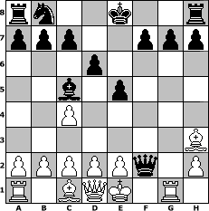 game notation in PGN-format [Event "mal spielen ohne drogen oder der k"] [Site "www.myChess.de"] [Date "2006.04.28"] [Round "1"] [White "Hobbykegler"] [Black "MaxPayne"] [ECO "A20"] [WhitemyELO "1060"] [BlackmyELO "1577"] [Result "0-1"] [TimeControl "10/1728000"] [WhiteDays "14"] [BlackDays "20"] [MyChessNo "24881"] 1. c4 e5 2. g4 Bc5 3. Nh3 d6 4. Nc3 Bxg4 5. Nd5 Nf6 6. Nxf6+ Qxf6 7. Rg1 Bxh3 8. Bxh3 Qxf2# 0-1 position notation in FEN-format rn2k2r/ppp2ppp/3p4/2b1p3/2P5/7B/PPPPPq1P/R1BQK1R1 - Qkq - 0 9 Captured white pieces: Captured black pieces: Click on a captured piece in order to display the desired move!