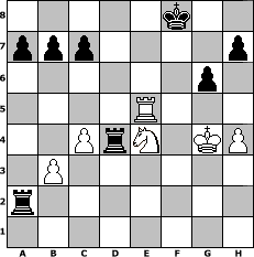 game notation in PGN-format [Event "Fr"] [Site "www.myChess.de"] [Date "2008.02.07"] [Round "2"] [White "Juliette2103"] [Black "Grubengeist"] [ECO "B08"] [WhitemyELO "1559"] [BlackmyELO "1962"] [Result "0-1"] [TimeControl "10/2592000"] [WhiteDays "026"] [BlackDays "103"] [MyChessNo "42414"] 1. e4 d6 2. d4 Nf6 3. Nc3 g6 4. Nf3 Bg7 5. Bc4 O-O 6. O-O Nxe4 7. Nxe4 d5 8. Bxd5 Qxd5 9. Re1 Nc6 10. c3 Bg4 11. h3 Bf5 12. Ng3 Be6 13. Bf4 Rac8 14. Ne5 Nxe5 15. Bxe5 Bh6 16. b3 f6 17. c4 Qd7 18. d5 fxe5 19. dxe6 Qxe6 20. Qe2 Rcd8 21. Qxe5 Qxe5 22. Rxe5 Bg7 23. Rae1 Bxe5 24. Rxe5 Rd1+ 25. Kh2 Rxf2 26. Rxe7 Rdd2 27. h4 Rxg2+ 28. Kh3 Rh2+ 29. Kg4 Rd4+ 30. Ne4 Kf8 31. Re5 Rxa2 0-1 position notation in FEN-format 5k2/ppp4p/6p1/4R3/2PrN1KP/1P6/r7/8 - - - 0 32 Captured white pieces: ![]() ![]() ![]() ![]() ![]() ![]() ![]() ![]() ![]() ![]() ![]() ![]() ![]() ![]() ![]() Captured black pieces: ![]() ![]() ![]() ![]() ![]() ![]() ![]() ![]() ![]() ![]() ![]() ![]() ![]() ![]() ![]() Click on a captured piece in order to display the desired move!