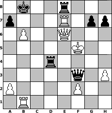 game notation in PGN-format [Event "Make myChess great again...."] [Site "www.myChess.de"] [Date "2017.02.11"] [Round "1"] [White "reisinger"] [Black "Schefsche"] [ECO "D06"] [WhitemyELO "1486"] [BlackmyELO "1376"] [Result "0-1"] [TimeControl "10/864000"] [WhiteDays "40"] [BlackDays "29"] [MyChessNo "106893"] 1. d4 d5 2. c4 c5 3. dxc5 Qa5+ 4. Nc3 d4 5. Qxd4 Nc6 6. Qd1 Bf5 7. e3 e6 8. Bd2 O-O-O 9. Nf3 Bg4 10. Ne4 Qc7 11. Be2 f5 12. Neg5 Qe7 13. b4 Nxb4 14. Qa4 Nc6 15. h3 Bxf3 16. Bxf3 Qxg5 17. Bxc6 Bxc5 18. Bxb7+ Kxb7 19. Rb1+ Bb6 20. Ba5 Qxg2 21. Ke2 Qe4 22. Qb3 Qc6 23. Rhc1 Qc5 24. Rc2 Qxa5 25. c5 Ne7 26. Qxe6 Nc6 27. cxb6 Nd4+ 28. exd4 Rhe8 29. Rc7+ Kb8 30. Re7 Qa6+ 31. Ke3 Qa3+ 32. Kf4 Rxd4+ 33. Kxf5 Qf3+ 0-1 position notation in FEN-format 1k2r3/p3R1pp/1P2Q3/5K2/3r4/5q1P/P4P2/1R6 - - - 1 34 Captured white pieces: Captured black pieces: Click on a captured piece in order to display the desired move!