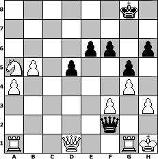 game notation in PGN-format [Event "April 2018"] [Site "www.myChess.de"] [Date "2018.04.11"] [Round "1"] [White "Achimkogge"] [Black "reisinger"] [ECO "D00"] [WhitemyELO "1378"] [BlackmyELO "1459"] [Result "1-0"] [TimeControl "10/1728000"] [WhiteDays "78"] [BlackDays "80"] [MyChessNo "111932"] 1. d4 d5 2. c3 Bf5 3. h3 Nc6 4. Bf4 Nf6 5. Nf3 h6 6. Nbd2 e6 7. e3 Bd6 8. Bb5 O-O 9. Bxd6 Qxd6 10. Bxc6 Qxc6 11. Ne5 Qb5 12. b4 a5 13. a4 Qb6 14. b5 c5 15. f3 Bd3 16. Nxd3 cxd4 17. exd4 Nh5 18. Ne5 Ng3 19. Rg1 f6 20. Nd7 Qc7 21. Nxf8 Qxc3 22. Kf2 Nf5 23. g4 Qxd4+ 24. Ke2 Qe5+ 25. Ne4 Qh2+ 26. Nf2 Nd6 27. Ng6 Rc8 28. Ne7+ Kf7 29. Nxc8 Qe5+ 30. Ne4 Nc4 31. Kf2 Qb2+ 32. Kg3 g5 33. Ncd6+ Nxd6 34. Nxd6+ Kg8 35. Nxb7 Qe5+ 36. Kg2 Qb2+ 37. Kh1 Qf2 38. Nxa5 1-0 position notation in FEN-format 6k1/8/4pp1p/NP1p2p1/P5P1/5P1P/5q2/R2Q2RK - - - 0 38 Captured white pieces: Captured black pieces: Click on a captured piece in order to display the desired move!