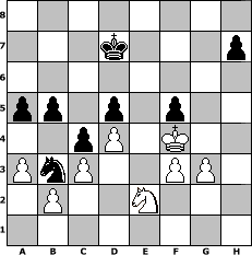 game notation in PGN-format [Event "er Geist des guten Weines"] [Site "www.myChess.de"] [Date "2019.10.01"] [Round "1"] [White "Grubengeist"] [Black "Peterlie77 (C)"] [ECO "C42"] [WhitemyELO "2079"] [BlackmyELO "2170"] [Result "1/2-1/2"] [TimeControl "10/2592000"] [WhiteDays "115"] [BlackDays "130"] [MyChessNo "115907"] 1. e4 e5 2. Nf3 Nf6 3. Nxe5 d6 4. Nf3 Nxe4 5. d4 d5 6. Bd3 Nc6 7. O-O Be7 8. Nbd2 Nxd2 9. Bxd2 O-O 10. c3 Bg4 11. h3 Bh5 12. g3 Bg6 13. Bxg6 fxg6 14. Kg2 Qd7 15. Qc2 Rae8 16. Rae1 a6 17. Bf4 Bf6 18. Qd3 Nd8 19. Be5 Nf7 20. Re2 c5 21. Rfe1 c4 22. Qd2 b5 23. a3 g5 24. Bxf6 gxf6 25. h4 gxh4 26. Nxh4 Ng5 27. Rxe8 Rxe8 28. Rxe8+ Qxe8 29. Qf4 Qe4+ 30. Qxe4 Nxe4 31. Nf5 Kf7 32. f3 Nd2 33. Ne3 Ke6 34. Kf2 Nb3 35. Ng2 Kd6 36. Nf4 Nc1 37. Ke3 f5 38. Kd2 Nb3+ 39. Ke3 a5 40. Ne2 Kd7 41. Kf4 1/2-1/2 position notation in FEN-format 8/3k3p/8/pp1p1p2/2pP1K2/PnP2PP1/1P2N3/8 - - - 3 41 Captured white pieces: Captured black pieces: Click on a captured piece in order to display the desired move!