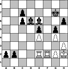 game notation in PGN-format [Event "3. Norderstedter DENK MAL Open 2012"] [Site "www.myChess.de"] [Date "2012.02.08"] [Round "1"] [White "faustballer"] [Black "Schachfedi"] [ECO "C65"] [WhitemyELO "1542"] [BlackmyELO "1797"] [Result "0-1"] [TimeControl "10/2592000"] [WhiteDays "30"] [BlackDays "28"] [MyChessNo "79800"] 1. e4 e5 2. Nf3 Nc6 3. Bb5 Nf6 4. Bxc6 dxc6 5. d3 Bd6 6. h3 O-O 7. Bg5 h6 8. Bh4 a5 9. a3 Qe7 10. Nbd2 b6 11. c3 Qe6 12. Qb3 Nh5 13. Qxe6 Bxe6 14. O-O g5 15. Bg3 Nxg3 16. fxg3 Kg7 17. Rad1 f6 18. c4 Bc5+ 19. Kh2 Rfd8 20. Nb3 Be7 21. g4 b5 22. Nc1 bxc4 23. d4 Rab8 24. dxe5 Rxb2 25. Nd4 Rxd4 26. Rxd4 fxe5 27. Rdd1 Bxa3 28. Rf3 Bd6 29. Re1 a4 30. Re2 a3 31. Rff2 c3 32. Nd3 a2 33. Nxb2 cxb2 0-1 position notation in FEN-format 8/2p3k1/2pbb2p/4p1p1/4P1P1/7P/pp2RRPK/8 - - - 0 34 Captured white pieces: ![]() ![]() ![]() ![]() ![]() ![]() ![]() ![]() ![]() ![]() ![]() ![]() ![]() ![]() ![]() Captured black pieces: ![]() ![]() ![]() ![]() ![]() ![]() ![]() ![]() ![]() ![]() ![]() ![]() ![]() ![]() ![]() Click on a captured piece in order to display the desired move!