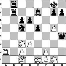 game notation in PGN-format [Event "Mitten ins Gr"] [Site "www.myChess.de"] [Date "2015.05.11"] [Round "1"] [White "lotchi"] [Black "Caligula"] [ECO "A04"] [WhitemyELO "1236"] [BlackmyELO "1344"] [Result "0-1"] [TimeControl "10/1728000"] [WhiteDays "00"] [BlackDays "58"] [MyChessNo "99179"] 1. Nf3 d6 2. Nc3 Nf6 3. e4 c6 4. d3 e5 5. Bg5 Bg4 6. h3 Bxf3 7. Qxf3 Be7 8. O-O-O Nbd7 9. Bxf6 Nxf6 10. Re1 b5 11. b4 O-O 12. g4 a5 13. bxa5 Qxa5 14. Kd2 Rfc8 15. g5 Nd7 16. Qg4 Rc7 17. h4 b4 18. Nce2 b3+ 19. Nc3 bxa2 20. Ra1 Rb8 21. Qd1 Nc5 22. Rxa2 Qb4 23. Qa1 Rcb7 24. Be2 Qd4 25. Rh2 f5 26. exf5 Qf4+ 27. Ke1 Qxh2 28. Bf1 Qf4 29. Ke2 Qxf5 30. Qc1 Qg4+ 31. Ke1 Qxh4 0-1 position notation in FEN-format 1r4k1/1r2b1pp/2pp4/2n1p1P1/7q/2NP4/R1P2P2/2Q1KBN1 - - - 0 32 Captured white pieces: Captured black pieces: Click on a captured piece in order to display the desired move!