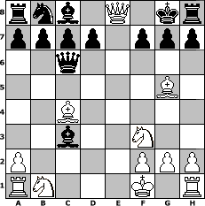game notation in PGN-format [Event "R"] [Site "www.myChess.de"] [Date "2005.07.20"] [Round "2"] [White "Baehr008"] [Black "Pocket"] [ECO "C40"] [WhitemyELO "1905"] [BlackmyELO "1310"] [Result "1-0"] [TimeControl "10/2592000"] [WhiteDays "60"] [BlackDays "50"] [MyChessNo "15281"] 1. e4 e5 2. Nf3 Bd6 3. Bc4 Nf6 4. d4 exd4 5. e5 Bb4+ 6. c3 dxc3 7. bxc3 Ba5 8. exf6 Qxf6 9. Bg5 Bxc3+ 10. Kf1 Qc6 11. Qe2+ Kf8 12. Qe7+ Kg8 13. Qe8# 1-0 position notation in FEN-format rnb1Q1kr/pppp1ppp/2q5/6B1/2B5/2b2N2/P4PPP/RN3K1R - - - 7 13 Captured white pieces: Captured black pieces: Click on a captured piece in order to display the desired move!