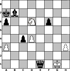 game notation in PGN-format [Event "Zum Vatertag"] [Site "www.myChess.de"] [Date "2017.05.27"] [Round "1"] [White "alpacino"] [Black "Joschi"] [ECO "A45"] [WhitemyELO "1335"] [BlackmyELO "1541"] [Result "0-1"] [TimeControl "10/2592000"] [WhiteDays "130"] [BlackDays "150"] [MyChessNo "108391"] 1. d4 Nf6 2. Nc3 d5 3. e3 e6 4. Bd2 c5 5. Be2 Nc6 6. Nf3 cxd4 7. exd4 Be7 8. a3 O-O 9. O-O a6 10. Bd3 b5 11. Bf4 Bd6 12. Bg3 Bxg3 13. fxg3 Bb7 14. Ne2 Qc7 15. h3 Rac8 16. c3 Na5 17. Ne5 Nc4 18. Bxc4 bxc4 19. Nf4 Ne4 20. Rf3 Rb8 21. g4 Bc8 22. Rb1 f6 23. Neg6 hxg6 24. Nxg6 Re8 25. Qe1 Rb3 26. Qh4 Kf7 27. Ne5+ Ke7 28. Ng6+ Kd8 29. Qe1 Qb6 30. Qh4 Rxb2 31. Re1 e5 32. Nxe5 Nxc3 33. Nf7+ Kd7 34. Rxe8 Kxe8 35. Re3+ Kd7 36. g5 Ne4 37. Qg4+ Kc7 38. Qf4+ Kb7 39. gxf6 gxf6 40. Rxe4 dxe4 41. Qxe4+ Ka7 42. Qe7+ Bb7 43. Nd6 Rxg2+ 44. Kf1 Qb1+ 45. Qe1 Rg1+ 46. Kxg1 Qxe1+ 0-1 position notation in FEN-format 8/kb6/p2N1p2/8/2pP4/P6P/8/4q1K1 - - - 0 47 Captured white pieces: Captured black pieces: Click on a captured piece in order to display the desired move!