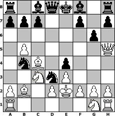 game notation in PGN-format [Event "2. Westerw"] [Site "www.myChess.de"] [Date "2012.01.02"] [Round "1"] [White "nogumo"] [Black "ClaudiaN"] [ECO "A00"] [WhitemyELO "1658"] [BlackmyELO "1736"] [Result "0-1"] [TimeControl "10/1728000"] [WhiteDays "20"] [BlackDays "20"] [MyChessNo "78901"] 1. b4 e5 2. b5 d5 3. Bb2 e4 4. e3 Nf6 5. c4 Nbd7 6. cxd5 Nxd5 7. Nc3 Nc5 8. Qh5 Nb4 9. Bc4 Ncd3+ 10. Ke2 g6 0-1 position notation in FEN-format r1bqkb1r/ppp2p1p/6p1/1P5Q/1nB1p3/2NnP3/PB1PKPPP/R5NR - kq - 0 11 Captured white pieces: ![]() ![]() ![]() ![]() ![]() ![]() ![]() ![]() ![]() ![]() ![]() ![]() ![]() ![]() ![]() Captured black pieces: ![]() ![]() ![]() ![]() ![]() ![]() ![]() ![]() ![]() ![]() ![]() ![]() ![]() ![]() ![]() Click on a captured piece in order to display the desired move!