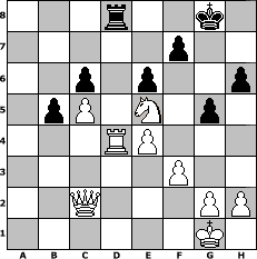 game notation in PGN-format [Event "Dabei ist alles 9"] [Site "www.myChess.de"] [Date "2010.03.22"] [Round "1"] [White "muellerh"] [Black "Knight"] [ECO "E20"] [WhitemyELO "1394"] [BlackmyELO "1135"] [Result "1-0"] [TimeControl "10/864000"] [WhiteDays "10"] [BlackDays "10"] [MyChessNo "64218"] 1. d4 Nf6 2. c4 e6 3. Nc3 Bb4 4. Bd2 d5 5. c5 Nc6 6. Nf3 O-O 7. a3 Bxc3 8. Bxc3 Re8 9. e3 Bd7 10. Bd3 Ne4 11. Rc1 Nxc3 12. Rxc3 Na5 13. b4 Nc4 14. Bxc4 dxc4 15. Rxc4 Bb5 16. Rc3 Bc6 17. O-O Bb5 18. Re1 c6 19. Qb3 a5 20. a4 Bxa4 21. Qxa4 b5 22. Qc2 axb4 23. Rb3 Ra4 24. Reb1 Qd5 25. Rxb4 Rxb4 26. Rxb4 h6 27. Ne5 Rd8 28. f3 g5 29. e4 Qxd4+ 30. Rxd4 1-0 position notation in FEN-format 3r2k1/5p2/2p1p2p/1pP1N1p1/3RP3/5P2/2Q3PP/6K1 - - - 0 30 Captured white pieces: Captured black pieces: Click on a captured piece in order to display the desired move!