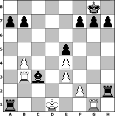 game notation in PGN-format [Event "2.No-Engine-Schachturnier"] [Site "www.myChess.de"] [Date "2013.08.15"] [Round "1"] [White "borsti"] [Black "Wulfen49"] [ECO "A02"] [WhitemyELO "1231"] [BlackmyELO "1283"] [Result "0-1"] [TimeControl "10/1728000"] [WhiteDays "20"] [BlackDays "19"] [MyChessNo "89796"] 1. f4 Nf6 2. f5 e6 3. fxe6 dxe6 4. d4 c5 5. Nf3 cxd4 6. Nxd4 Bc5 7. Nf3 Qxd1+ 8. Kxd1 O-O 9. Nc3 Rd8+ 10. Bd2 Nc6 11. Kc1 Nd4 12. e3 Nxf3 13. gxf3 e5 14. b3 Ba3+ 15. Kb1 Rxd2 16. Bd3 Bb4 17. Ne4 Nxe4 18. fxe4 Bc3 19. Kc1 Bg4 20. Rb1 Be2 21. Bxe2 Rxe2 22. Rg1 Rd8 23. b4 Rdd2 24. Rb3 Rxc2+ 25. Kb1 Rb2+ 26. Kc1 Rec2+ 27. Kd1 Rd2+ 28. Kc1 Rdc2+ 29. Kd1 Rxa2 30. Rg3 Rxh2 31. Rg1 Ra1+ 0-1 position notation in FEN-format 6k1/pp3ppp/8/4p3/1P2P3/1Rb1P3/5P1r/r2K2R1 - - - 2 32 Captured white pieces: Captured black pieces: Click on a captured piece in order to display the desired move!