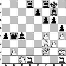 game notation in PGN-format [Event "Godzilla Mannschaftsturnier 2013"] [Site "www.myChess.de"] [Date "2013.08.15"] [Round "1"] [Board "4"] [White "mattse"] [Black "Schachfedi"] [ECO "B23"] [WhitemyELO "1671"] [BlackmyELO "1756"] [Result "0-1"] [TimeControl "10/3456000"] [WhiteDays "40"] [BlackDays "40"] [MyChessNo "89734"] 1. e4 c5 2. Nc3 g6 3. d4 cxd4 4. Qxd4 Nf6 5. Nd5 Bg7 6. c3 O-O 7. h4 d6 8. Bg5 Nxd5 9. Qxd5 Nd7 10. Qd2 Nf6 11. Qc2 d5 12. Bxf6 Bxf6 13. Rd1 Qa5 14. Rxd5 Qxa2 15. Ne2 Be6 16. Nc1 Qa1 17. Rd1 Rad8 18. Bd3 Qa5 19. g3 Qb6 20. Kf1 h5 21. Kg2 a5 22. f4 Bg7 23. Be2 a4 24. Bf3 Qa5 25. Qb1 b5 26. e5 b4 27. cxb4 Qxb4 28. Qc2 Bf5 29. Qf2 f6 30. e6 Bxe6 31. Kh2 Bc4 0-1 position notation in FEN-format 3r1rk1/4p1b1/5pp1/7p/pqb2P1P/5BP1/1P3Q1K/2NR3R - - - 2 32 Captured white pieces: Captured black pieces: Click on a captured piece in order to display the desired move!