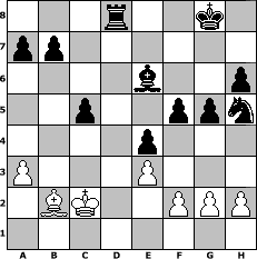 game notation in PGN-format [Event "Trotz Sturm und Regen die Figuren bewegen"] [Site "www.myChess.de"] [Date "2020.03.16"] [Round "1"] [White "beowulf"] [Black "Ziegert"] [ECO "A22"] [WhitemyELO "1338"] [BlackmyELO "1947"] [Result "0-1"] [TimeControl "10/2592000"] [WhiteDays "30"] [BlackDays "30"] [MyChessNo "117543"] 1. c4 e5 2. Nc3 Nf6 3. d3 Bb4 4. Bg5 h6 5. Bh4 Nc6 6. e3 g5 7. Bg3 d5 8. a3 Bxc3+ 9. bxc3 dxc4 10. Nf3 cxd3 11. Qxd3 Qxd3 12. Bxd3 e4 13. Nd4 Nxd4 14. Bb5+ Nxb5 15. Kd2 Nh5 16. Be5 O-O 17. c4 Re8 18. Bb2 Nd6 19. Rhd1 Nxc4+ 20. Kc2 f5 21. Rd4 Be6 22. Rad1 c5 23. Rd6 Nxd6 24. Rxd6 Rad8 25. Rxd8 Rxd8 0-1 position notation in FEN-format 3r2k1/pp6/4b2p/2p2ppn/4p3/P3P3/1BK2PPP/8 - - - 0 26 Captured white pieces: Captured black pieces: Click on a captured piece in order to display the desired move!