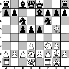| game notation in PGN-format [Event "Venezuela Er"] [Site "www.myChess.de"] [Date "2017.03.15"] [Round "1"] [White "martinus"] [Black "zoli"] [ECO "A00"] [WhitemyELO "1762"] [BlackmyELO "1867"] [Result "0-1"] [TimeControl "10/1728000"] [WhiteDays "00"] [BlackDays "16"] [MyChessNo "107361"] 1. d3 d5 2. Nf3 c5 3. g3 Nc6 4. Bg2 Nf6 5. O-O e5 6. Bg5 Bd6 7. Nbd2 Be7 0-1 position notation in FEN-format r1bqk2r/pp2bppp/2n2n2/2ppp1B1/8/3P1NP1/PPPNPPBP/R2Q1RK1 - kq - 4 8 Captured white pieces:                              Captured black pieces:                               Click on a captured piece in order to display the desired move!