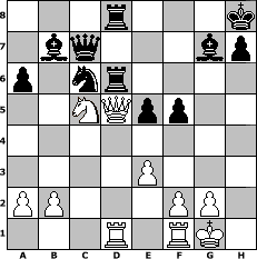game notation in PGN-format [Event "Schachkreis #2"] [Site "www.myChess.de"] [Date "2018.07.05"] [Round "1"] [White "reisinger"] [Black "Joschi"] [ECO "A56"] [WhitemyELO "1485"] [BlackmyELO "1546"] [Result "0-1"] [TimeControl "10/2592000"] [WhiteDays "30"] [BlackDays "30"] [MyChessNo "112513"] 1. d4 Nf6 2. c4 c5 3. Nf3 g6 4. Nc3 cxd4 5. Nxd4 Bg7 6. Bf4 d6 7. h3 O-O 8. e3 e5 9. Bxe5 dxe5 10. Ndb5 Nc6 11. Be2 a6 12. Nd6 Qc7 13. Rc1 Rd8 14. c5 b6 15. Qd2 bxc5 16. Rd1 Bb7 17. O-O Rd7 18. Bg4 Nxg4 19. hxg4 Rad8 20. Nce4 f5 21. Qd5+ Kh8 22. gxf5 gxf5 23. Nxc5 Rxd6 0-1 position notation in FEN-format 3r3k/1bq3bp/p1nr4/2NQpp2/8/4P3/PP3PP1/3R1RK1 - - - 0 24 Captured white pieces: Captured black pieces: Click on a captured piece in order to display the desired move!