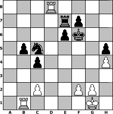 game notation in PGN-format [Event "Schinderhannes-Cup"] [Site "www.myChess.de"] [Date "2011.05.10"] [Round "1"] [Board "1"] [White "Fighter"] [Black "Holzhacker"] [ECO "B41"] [WhitemyELO "2178"] [BlackmyELO "2073"] [Result "1-0"] [TimeControl "10/2592000"] [WhiteDays "129"] [BlackDays "128"] [MyChessNo "73821"] 1. e4 c5 2. Nf3 e6 3. d4 cxd4 4. Nxd4 Nf6 5. Nc3 Bb4 6. e5 Nd5 7. Bd2 Nxc3 8. bxc3 Be7 9. Qg4 g6 10. h4 h5 11. Qg3 a6 12. Be2 d5 13. Rb1 Qc7 14. O-O Nd7 15. Bf4 Nc5 16. c4 dxc4 17. Rfe1 Na4 18. Bf3 Rb8 19. Bg5 Bxg5 20. Qxg5 Nc3 21. Rb2 Bd7 22. Re3 Na4 23. Qf6 Rg8 24. Rb1 b5 25. Rd1 Nc5 26. Re2 Kf8 27. Red2 Re8 28. Ne2 Bc6 29. Bxc6 Qxc6 30. Rd4 Qb7 31. Nf4 Qe7 32. Nh3 Qxf6 33. exf6 g5 34. Nxg5 Rg6 35. a4 Rxf6 36. Nh7+ Kg7 37. Nxf6 Kxf6 38. axb5 axb5 39. Rd8 Re7 40. Rb1 1-0 position notation in FEN-format 3R4/4rp2/4pk2/1pn4p/2p4P/8/2P2PP1/1R4K1 - - - 3 40 Captured white pieces: Captured black pieces: Click on a captured piece in order to display the desired move!