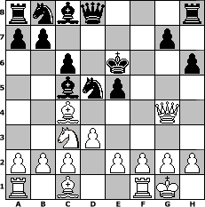 game notation in PGN-format [Event "Wrixum - Open die XIII"] [Site "www.myChess.de"] [Date "2016.09.28"] [Round "1"] [White "Ziegert"] [Black "reisinger"] [ECO "C41"] [WhitemyELO "1490"] [BlackmyELO "1474"] [Result "1-0"] [TimeControl "10/2592000"] [WhiteDays "30"] [BlackDays "30"] [MyChessNo "105089"] 1. e4 e5 2. Nf3 d6 3. Bc4 Nf6 4. Ng5 d5 5. exd5 Nxd5 6. d3 h6 7. Nxf7 Kxf7 8. Qf3+ Ke6 9. O-O Bc5 10. Nc3 c6 11. Qg4+ 1-0 position notation in FEN-format rnbq3r/pp4p1/2p1k2p/2bnp3/2B3Q1/2NP4/PPP1PPPP/R1B2RK1 - - - 1 11 Captured white pieces: Captured black pieces: Click on a captured piece in order to display the desired move!