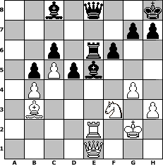 game notation in PGN-format [Event "Sommerpause"] [Site "www.myChess.de"] [Date "2011.06.29"] [Round "2"] [White "Naunhofer"] [Black "Greenhorn"] [ECO "C42"] [WhitemyELO "1611"] [BlackmyELO "1641"] [Result "1-0"] [TimeControl "10/864000"] [WhiteDays "10"] [BlackDays "00"] [MyChessNo "74797"] 1. e4 e5 2. Nf3 Nf6 3. Nxe5 d6 4. Nf3 Nxe4 5. d4 Bg4 6. Be2 Be7 7. O-O Bd7 8. Nbd2 Nf6 9. b3 d5 10. c4 c6 11. Bb2 O-O 12. Qc2 Na6 13. Ne5 Be6 14. a3 Rc8 15. f4 Rc7 16. f5 Bc8 17. Rae1 b5 18. c5 Nb8 19. b4 Nbd7 20. h3 Ne8 21. Qd3 Nxe5 22. dxe5 f6 23. e6 Kh8 24. Bh5 a5 25. Qg3 Ra7 26. Rf4 Qc7 27. Qh4 axb4 28. axb4 Ra2 29. Rb1 Qa7 30. Qg3 Bd8 31. Bd1 Bc7 32. Bb3 Rxb2 33. Rxb2 Qb8 34. Qe1 Bxf4 35. Nf3 Bb7 36. Ra2 Nc7 37. Nd4 Re8 38. g3 Be5 39. Nf3 Nxe6 40. fxe6 Rxe6 41. Kg2 Qe8 42. Re2 Bc8 43. g4 1-0 position notation in FEN-format 2b1q2k/6pp/2p1rp2/1pPpb3/1P4P1/1B3N1P/4R1K1/4Q3 - - - 0 43 Captured white pieces: Captured black pieces: Click on a captured piece in order to display the desired move!