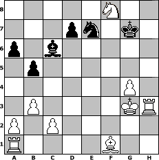 game notation in PGN-format [Event "Die Eisenbahner sind wieder da!!"] [Site "www.myChess.de"] [Date "2016.09.09"] [Round "1"] [White "muetoe"] [Black "espero"] [Variant "Fischerrandom"] [SetUp "1"] [FEN "bnnrqbkr/pppppppp/8/8/8/8/PPPPPPPP/BNNRQBKR w KQkq - 0 1"] [WhitemyELO "1966"] [BlackmyELO "1892"] [Result "1-0"] [TimeControl "10/1728000"] [WhiteDays "59"] [BlackDays "74"] [MyChessNo "104850"] 1. e4 c5 2. Nc3 e6 3. d4 a6 4. dxc5 Bxc5 5. Nd3 Ba7 6. h4 O-O 7. h5 f5 8. exf5 Rxf5 9. h6 Nc6 10. hxg7 Qg6 11. Ne2 b5 12. Rh3 Rg5 13. Nef4 Qf5 14. b3 N8e7 15. Qd2 e5 16. Ne2 Rxg7 17. Ng3 Qg5 18. Nh5 Rg6 19. Qxg5 Rxg5 20. Nf6+ Kg7 21. Nxh7 Rf5 22. g4 Rf6 23. Nxe5 Bxf2+ 24. Kh2 Bd4 25. Nxc6 Rf2+ 26. Kg3 Rf3+ 27. Kxf3 Bxc6+ 28. Kg3 Bxa1 29. Rxa1 Rf8 30. Nxf8 1-0 position notation in FEN-format 5N2/3pn1k1/p1b5/1p6/6P1/1P4KR/P1P5/R4B2 - - - 0 30 Captured white pieces: Captured black pieces: Click on a captured piece in order to display the desired move!