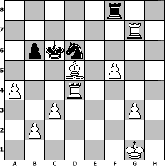 game notation in PGN-format [Event "> 1500"] [Site "www.myChess.de"] [Date "2010.03.18"] [Round "1"] [White "Caligula"] [Black "Winston"] [ECO "B01"] [WhitemyELO "1318"] [BlackmyELO "1389"] [Result "1-0"] [TimeControl "10/2592000"] [WhiteDays "180"] [BlackDays "180"] [MyChessNo "64113"] 1. e4 d5 2. exd5 Qxd5 3. Nc3 Qd8 4. Nf3 a6 5. d4 h6 6. Bc4 Bg4 7. Ne5 e6 8. Qxg4 Nf6 9. Qf4 Bd6 10. O-O Nbd7 11. Re1 Qe7 12. Ne4 Bxe5 13. dxe5 Nxe4 14. Qxe4 O-O-O 15. f4 Nc5 16. Qe2 f6 17. exf6 Qxf6 18. c3 Rhe8 19. Be3 Qf5 20. g4 Qf8 21. Qf2 Ne4 22. Qf3 Ng5 23. Qg2 Nf7 24. Bf2 Kb8 25. Bxe6 Nd6 26. f5 Qf6 27. Bd4 Qg5 28. Re5 Nb5 29. Be3 Qf6 30. Qg3 g5 31. a4 Nd6 32. Bd4 Qf8 33. Rae1 a5 34. Rxa5 b6 35. Rae5 Nb7 36. Rb5 Rd6 37. Be5 Red8 38. Bxd6 Nxd6 39. Rd5 Qe8 40. Rd4 Qc6 41. Bd5 Qd7 42. Re6 Qh7 43. Qe5 h5 44. Re7 Qh6 45. Qg7 Qh8 46. Rxc7 Qxg7 47. Rxg7 hxg4 48. Rxg5 g3 49. hxg3 Rf8 50. Be6 Kc7 51. Rg7+ Kc6 52. Bd5+ 1-0 position notation in FEN-format 5r2/6R1/1pkn4/3B1P2/P2R4/2P3P1/1P6/6K1 - - - 6 52 Captured white pieces: Captured black pieces: Click on a captured piece in order to display the desired move!
