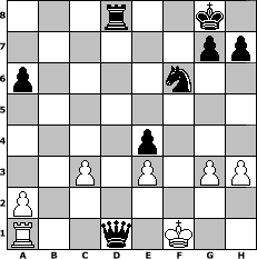 game notation in PGN-format [Event "Schach dem" Nikolaus""] [Site "www.myChess.de"] [Date "2009.11.28"] [Round "1"] [White "reisender"] [Black "Steffi"] [ECO "C45"] [WhitemyELO "1357"] [BlackmyELO "1546"] [Result "0-1"] [TimeControl "10/2592000"] [WhiteDays "120"] [BlackDays "119"] [MyChessNo "61010"] 1. e4 e5 2. Nf3 Nc6 3. d4 exd4 4. Nxd4 d6 5. Bb5 Bd7 6. O-O Nf6 7. Re1 Be7 8. c3 O-O 9. Nd2 a6 10. Bc4 Ne5 11. Be2 c5 12. N4f3 Bc6 13. Nxe5 dxe5 14. Nc4 Qc7 15. Be3 Rad8 16. Qc1 Bxe4 17. Rd1 b5 18. Rxd8 Rxd8 19. Nd2 c4 20. b3 Bd3 21. Bf3 e4 22. Bd1 Bd6 23. g3 Nd5 24. Bg5 f6 25. Bxf6 Nxf6 26. bxc4 bxc4 27. Bc2 Bc5 28. Bxd3 cxd3 29. Qe1 Qe5 30. Nc4 Qf5 31. Ne3 Qf3 32. h3 d2 33. Qf1 Bxe3 34. fxe3 Qxf1+ 35. Kxf1 d1=Q+ 0-1 position notation in FEN-format 3r2k1/6pp/p4n2/8/4p3/2P1P1PP/P7/R2q1K2 - - - 0 36 Captured white pieces: Captured black pieces: Click on a captured piece in order to display the desired move!
