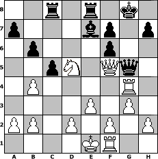 | game notation in PGN-format [Event "Wanderpokal November 2006 -"] [Site "www.myChess.de"] [Date "2006.12.01"] [Round "1"] [White "nordlicht"] [Black "reisinger"] [Variant "Fischerrandom"] [SetUp "1"] [FEN "brnbkrnq/pppppppp/8/8/8/8/PPPPPPPP/BRNBKRNQ w KQkq - 0 1"] [WhitemyELO "1969"] [BlackmyELO "1534"] [Result "1-0"] [TimeControl "10/864000"] [WhiteDays "10"] [BlackDays "10"] [MyChessNo "30661"] 1. b3 c5 2. Nd3 b6 3. e3 Nd6 4. Bf3 Ne4 5. g3 d5 6. c4 e6 7. Nf4 Nef6 8. cxd5 exd5 9. Nge2 Ne7 10. Bxf6 gxf6 11. Nxd5 Nxd5 12. Bxd5 Bxd5 13. Qxd5 O-O 14. b4 Rc8 15. Rc1 Be7 16. Nf4 Rfd8 17. Qf5 Qg7 18. Rc4 Qg5 19. Nd5 Re8 20. Rg4 1-0 position notation in FEN-format 2r1r1k1/p3bp1p/1p3p2/2pN1Qq1/1P4R1/4P1P1/PP1P1P1P/4KR2 - K - 12 20 Captured white pieces:                              Captured black pieces:                               Click on a captured piece in order to display the desired move!