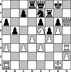 | game notation in PGN-format [Event "Winterturnier"] [Site "www.myChess.de"] [Date "2009.11.12"] [Round "1"] [White "muellerh"] [Black "Caligula"] [ECO "D04"] [WhitemyELO "1480"] [BlackmyELO "1365"] [Result "1-0"] [TimeControl "10/3456000"] [WhiteDays "085"] [BlackDays "120"] [MyChessNo "60549"] 1. d4 d5 2. Nf3 Nf6 3. e3 Nc6 4. c4 e6 5. Nc3 Bb4 6. Bd2 O-O 7. Be2 dxc4 8. Bxc4 a6 9. a3 Bxc3 10. Bxc3 Ne4 11. O-O Nxc3 12. bxc3 b5 13. Bd3 Bb7 14. Qc2 f6 15. Bxh7+ Kh8 16. Bg6 Ne7 17. Bd3 f5 18. Ne5 Rc8 19. Qe2 Qe8 20. g4 Be4 21. g5 Bxd3 22. Qxd3 Ng6 23. f4 Rd8 24. Qe2 Ne7 25. Qg2 g6 26. Qh3+ Kg7 27. Qh6+ Kg8 28. Rf3 Rf7 29. Rh3 1-0 position notation in FEN-format 3rq1k1/2p1nr2/p3p1pQ/1p2NpP1/3P1P2/P1P1P2R/7P/R5K1 - - - 7 29 Captured white pieces:                              Captured black pieces:                               Click on a captured piece in order to display the desired move!