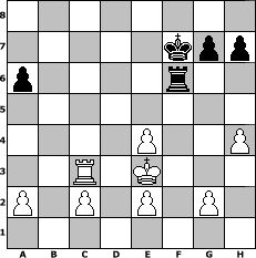 game notation in PGN-format [Event "Make myChess great again...."] [Site "www.myChess.de"] [Date "2017.02.11"] [Round "1"] [White "sprinterde"] [Black "faustballer"] [ECO "C35"] [WhitemyELO "1729"] [BlackmyELO "1503"] [Result "1-0"] [TimeControl "10/864000"] [WhiteDays "40"] [BlackDays "40"] [MyChessNo "106888"] 1. e4 e5 2. f4 exf4 3. Nf3 Be7 4. h4 d6 5. d4 Nf6 6. Nc3 Bg4 7. Bxf4 a6 8. Bc4 b5 9. Bb3 b4 10. Nd5 Nxd5 11. Bxd5 c6 12. Bxf7+ Kxf7 13. Ng5+ Bxg5 14. Qxg4 Bxf4 15. Rf1 Re8 16. Rxf4+ Kg8 17. O-O-O Nd7 18. Rdf1 Rf8 19. Qe6+ Kh8 20. Qxd7 Rxf4 21. Qxd8+ Rxd8 22. Rxf4 Kg8 23. Kd2 c5 24. Ke3 Re8 25. dxc5 dxc5 26. Rf5 Rc8 27. Rd5 Rc6 28. Kd3 c4+ 29. Ke3 Rg6 30. Kf3 Rf6+ 31. Ke3 Kf7 32. Rc5 c3 33. bxc3 bxc3 34. Rxc3 1-0 position notation in FEN-format 8/5kpp/p4r2/8/4P2P/2R1K3/P1P1P1P1/8 - - - 0 34 Captured white pieces: Captured black pieces: Click on a captured piece in order to display the desired move!