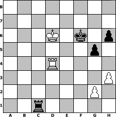 game notation in PGN-format [Event "Aschermittwoch 2014"] [Site "www.myChess.de"] [Date "2014.03.06"] [Round "1"] [White "Cuibono"] [Black "Koprek"] [ECO "C11"] [WhitemyELO "1939"] [BlackmyELO "2065"] [Result "1/2-1/2"] [TimeControl "10/3456000"] [WhiteDays "265"] [BlackDays "224"] [MyChessNo "93328"] 1. e4 e6 2. d4 d5 3. Nc3 Nf6 4. e5 Nfd7 5. f4 c5 6. Nf3 Nc6 7. Be3 Be7 8. Qd2 O-O 9. Be2 a6 10. O-O b5 11. a3 Bb7 12. Rad1 Qb6 13. Qe1 cxd4 14. Nxd4 Bc5 15. Qf2 Rac8 16. Bf3 Bxd4 17. Bxd4 Nxd4 18. Rxd4 a5 19. Rc1 b4 20. axb4 axb4 21. Ne2 Ba6 22. Rdd1 Qxf2+ 23. Kxf2 Bxe2 24. Bxe2 Rc7 25. Ke3 g6 26. Bb5 Nb6 27. Rd4 Rb8 28. Bd3 Nc8 29. f5 Na7 30. fxe6 fxe6 31. Rf4 Nc6 32. Rf6 Re7 33. Kf4 b3 34. c3 Kg7 35. Ra1 g5+ 36. Ke3 Nxe5 37. Rff1 h6 38. h3 Rd8 39. Ra4 Rdd7 40. Be2 Rc7 41. Ra6 Nd7 42. Kd4 Nc5 43. Rb6 e5+ 44. Kxd5 Na4 45. Rb4 Red7+ 46. Ke4 Nxb2 47. Rb1 Rd2 48. Ke3 Rc2 49. Rxb3 Na4 50. c4 Nc5 51. Ra3 Ne6 52. Bf1 Rf7 53. Ke4 Nc5+ 54. Kd5 Nd7 55. Re3 Ra2 56. Rb7 Rd2+ 57. Rd3 Rc2 58. Kd6 Rxf1 59. Rxd7+ Kf6 60. Rd8 e4 61. Rd4 Rfc1 62. Rf8+ Kg7 63. Re8 Rxc4 64. Rexe4 Rxd4+ 65. Rxd4 Kf6 1/2-1/2 position notation in FEN-format 8/8/3K1k1p/6p1/3R4/7P/6P1/2r5 - - - 1 66 Captured white pieces: Captured black pieces: Click on a captured piece in order to display the desired move!