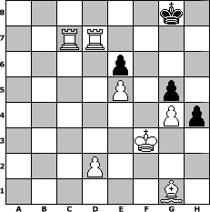 game notation in PGN-format [Event "Lapislazuli"] [Site "www.myChess.de"] [Date "2022.04.10"] [Round "1"] [White "lotchi"] [Black "Achimkogge"] [ECO "D01"] [WhitemyELO "1255"] [BlackmyELO "1458"] [Result "1-0"] [TimeControl "10/864000"] [WhiteDays "60"] [BlackDays "58"] [MyChessNo "125239"] 1. d4 d5 2. Nc3 c6 3. Bf4 Nf6 4. h3 Bf5 5. e3 e6 6. Nf3 Bb4 7. Bd3 Ne4 8. O-O Bxc3 9. bxc3 Nxc3 10. Qe1 Bxd3 11. cxd3 Qa5 12. Rc1 Qxa2 13. Rxc3 Qa5 14. Rb3 Qxe1 15. Rxe1 b5 16. Rc1 O-O 17. Ne5 a6 18. Nxc6 Nxc6 19. Rxc6 h6 20. Ra3 g5 21. Bh2 a5 22. Bd6 Rfe8 23. g4 Ra7 24. e4 Kh7 25. Bc5 Raa8 26. Rb6 dxe4 27. dxe4 a4 28. Rxb5 Rec8 29. Rb7 Kg7 30. f3 Rc6 31. Rb6 Rc7 32. Kg2 Kg6 33. e5 h5 34. Rb4 h4 35. Rbxa4 Rb8 36. Ra8 Rb2+ 37. Kg1 Kg7 38. R8a7 Rc8 39. R7a4 Kg6 40. Rb4 Re2 41. Rd3 Ra8 42. Rb1 Ra2 43. d5 Rg2+ 44. Kf1 Rh2 45. d6 Rh1+ 46. Bg1 Rxh3 47. d7 Ra8 48. Rc1 Rd8 49. Kf2 Rg3 50. Rc8 Rxd7 51. Rxd7 Kg7 52. Rcc7 Rh3 53. Rxf7+ Kg8 54. Rfd7 Rxf3+ 55. Kxf3 1-0 position notation in FEN-format 6k1/2RR4/4p3/4P1p1/6Pp/5K2/3P4/6B1 - - - 0 55 Captured white pieces: Captured black pieces: Click on a captured piece in order to display the desired move!