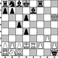 game notation in PGN-format [Event "2013 zum Ersten"] [Site "www.myChess.de"] [Date "2013.01.01"] [Round "1"] [White "Schefsche"] [Black "lotchi"] [ECO "C21"] [WhitemyELO "1435"] [BlackmyELO "1268"] [Result "1-0"] [TimeControl "10/2592000"] [WhiteDays "78"] [BlackDays "00"] [MyChessNo "85794"] 1. e4 e5 2. d4 exd4 3. Nf3 c5 4. Bc4 h6 5. Ne5 Qe7 6. Nxf7 Rh7 7. Qh5 g6 8. Qxg6 Rg7 9. Nd6+ Kd8 10. Nf7+ Ke8 11. Nd6+ Kd8 12. Qh5 Qxd6 13. Bxg8 Rxg8 14. g3 Qg6 15. Qh4+ Be7 16. Qf4 Rf8 17. Qxh6 Qxe4+ 18. Kd1 d6 19. Re1 Qf3+ 20. Re2 Qh1+ 21. Re1 Qf3+ 22. Re2 Qh1+ 23. Kd2 1-0 position notation in FEN-format rnbk1r2/pp2b3/3p3Q/2p5/3p4/6P1/PPPKRP1P/RNB4q - - - 9 23 Captured white pieces: Captured black pieces: Click on a captured piece in order to display the desired move!
