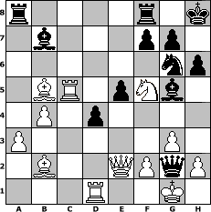 game notation in PGN-format [Event "Endlich Fr"] [Site "www.myChess.de"] [Date "2014.03.25"] [Round "1"] [White "gunni50"] [Black "Winston"] [ECO "B28"] [WhitemyELO "1217"] [BlackmyELO "1483"] [Result "0-1"] [TimeControl "10/1728000"] [WhiteDays "52"] [BlackDays "54"] [MyChessNo "93592"] 1. e4 c5 2. Nf3 a6 3. Bc4 e6 4. Nc3 Nc6 5. O-O h6 6. b3 b5 7. Bd3 Bd6 8. Bb2 Nge7 9. Re1 Ng6 10. a3 Qf6 11. Rb1 Nf4 12. Nd5 Qd8 13. Nc3 O-O 14. Ne2 Nxe2+ 15. Qxe2 Qc7 16. c4 Bb7 17. g3 e5 18. cxb5 axb5 19. Bxb5 Ne7 20. d4 cxd4 21. Rbc1 Qd8 22. b4 Kh8 23. Red1 Ng6 24. Nh4 Be7 25. Nf5 Bg5 26. Rc2 d5 27. exd5 Qxd5 28. Rc5 Qg2# 0-1 position notation in FEN-format r4r1k/1b3pp1/6np/1BR1pNb1/1P1p4/P5P1/1B2QPqP/3R2K1 - - - 2 29 Captured white pieces: Captured black pieces: Click on a captured piece in order to display the desired move!