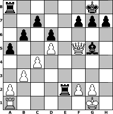 game notation in PGN-format [Event "Mitten ins Gr"] [Site "www.myChess.de"] [Date "2015.05.11"] [Round "2"] [White "beowulf"] [Black "Caligula"] [ECO "A22"] [WhitemyELO "1347"] [BlackmyELO "1344"] [Result "1-0"] [TimeControl "10/1728000"] [WhiteDays "58"] [BlackDays "41"] [MyChessNo "99192"] 1. c4 e5 2. Nc3 Nf6 3. d4 exd4 4. Qxd4 Be7 5. Bg5 Nc6 6. Qd1 d6 7. e4 O-O 8. Nf3 Bg4 9. Be2 Be6 10. O-O a6 11. b3 Qd7 12. Re1 b6 13. Nd5 a5 14. Nd4 Bxd5 15. exd5 Nxd4 16. h3 Nf5 17. Bg4 Nxg4 18. hxg4 Bxg5 19. gxf5 Qxf5 20. Re2 Rfe8 21. Qc2 Rxe2 22. Qxf5 1-0 position notation in FEN-format r5k1/2p2ppp/1p1p4/p2P1Qb1/2P5/1P6/P3rPP1/R5K1 - - - 0 22 Captured white pieces: Captured black pieces: Click on a captured piece in order to display the desired move!