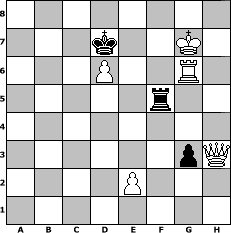 game notation in PGN-format [Event "Februar 2019"] [Site "www.myChess.de"] [Date "2019.02.12"] [Round "1"] [White "Andylein1989"] [Black "Joschi"] [ECO "B10"] [WhitemyELO "1615"] [BlackmyELO "1570"] [Result "1-0"] [TimeControl "10/1728000"] [WhiteDays "140"] [BlackDays "140"] [MyChessNo "114367"] 1. e4 c6 2. Nf3 d5 3. exd5 cxd5 4. d4 Nf6 5. c3 Nc6 6. Bd3 Bg4 7. Nbd2 e6 8. Nf1 Be7 9. Ng3 Qc7 10. h3 Bxf3 11. Qxf3 O-O 12. Bd2 a6 13. h4 b5 14. h5 Rfd8 15. Bf4 Bd6 16. Bxd6 Qxd6 17. Kd2 Na5 18. h6 Ne4+ 19. Nxe4 dxe4 20. Qxe4 g6 21. Qf3 Nc4+ 22. Bxc4 bxc4 23. Qf6 Qf8 24. b3 Rac8 25. Rac1 Rd5 26. g4 e5 27. bxc4 Rxc4 28. Qxa6 Qc8 29. Qxc8+ Rxc8 30. Ke3 exd4+ 31. cxd4 Re8+ 32. Kd3 Red8 33. Rc4 Ra5 34. a4 f6 35. f4 g5 36. f5 Kf7 37. Re1 Rd7 38. Kc3 Rda7 39. Ra1 Ke7 40. Rc5 Rxa4 41. Rxa4 Rxa4 42. Rc7+ Kd6 43. Rxh7 Ra3+ 44. Kc4 Rh3 45. Rh8 Ke7 46. Kd5 Kf7 47. Rh7+ Kg8 48. Rg7+ Kf8 49. Rg6 Kf7 50. Kd6 Rh4 51. d5 Rxg4 52. Rg7+ Kf8 53. Ke6 Rh4 54. Rg6 g4 55. Kxf6 g3 56. d6 Ke8 57. Kg7 Rf4 58. h7 Rxf5 59. h8=Q+ Kd7 60. Qh3 1-0 position notation in FEN-format 8/3k2K1/3P2R1/5r2/8/6pQ/4P3/8 - - - 2 60 Captured white pieces: ![]() ![]() ![]() ![]() ![]() ![]() ![]() ![]() ![]() ![]() ![]() ![]() ![]() ![]() ![]() Captured black pieces: ![]() ![]() ![]() ![]() ![]() ![]() ![]() ![]() ![]() ![]() ![]() ![]() ![]() ![]() ![]() Click on a captured piece in order to display the desired move!