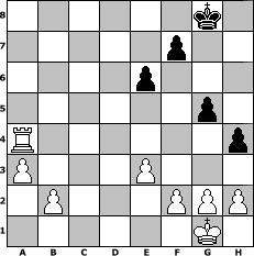 game notation in PGN-format [Event "Winterende2014"] [Site "www.myChess.de"] [Date "2014.03.06"] [Round "1"] [White "lasker"] [Black "Haneken"] [ECO "D20"] [WhitemyELO "1155"] [BlackmyELO "1037"] [Result "1-0"] [TimeControl "10/1728000"] [WhiteDays "25"] [BlackDays "79"] [MyChessNo "93349"] 1. d4 d5 2. c4 dxc4 3. e3 Be6 4. Nc3 Nc6 5. d5 Bxd5 6. Nxd5 e6 7. Nc3 Bb4 8. Bd2 Nf6 9. Nf3 Bxc3 10. Bxc3 Nh5 11. Be2 O-O 12. O-O b5 13. a3 Qd5 14. Nd4 Ne5 15. Bxh5 g6 16. Bf3 Qd8 17. Bxa8 Qxa8 18. Nxb5 Qb8 19. Bxe5 Qxb5 20. Qf3 Qxe5 21. Rab1 h5 22. Rfc1 Rd8 23. Rxc4 a5 24. Qe2 c5 25. Qc2 Rc8 26. Rc1 h4 27. Rxc5 Rxc5 28. Qxc5 Qxc5 29. Rxc5 a4 30. Rc4 g5 31. Rxa4 1-0 position notation in FEN-format 6k1/5p2/4p3/6p1/R6p/P3P3/1P3PPP/6K1 - - - 0 31 Captured white pieces: Captured black pieces: Click on a captured piece in order to display the desired move!