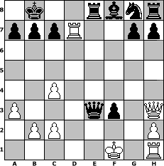 game notation in PGN-format [Event "1. Mannschaftsturnier 2004"] [Site "www.myChess.de"] [Date "2004.11.16"] [Round "2"] [Board "3"] [White "Andylein1989"] [Black "Blacky"] [ECO "C50"] [WhitemyELO "1275"] [BlackmyELO "1747"] [Result "0-1"] [TimeControl "10/2592000"] [WhiteDays "89"] [BlackDays "60"] [MyChessNo "8105"] 1. e4 e5 2. Nf3 Nc6 3. Bc4 Na5 4. Nxe5 Nxc4 5. Nxc4 d5 6. exd5 Qxd5 7. Qe2+ Be6 8. d3 Qxg2 9. Qf1 Qf3 10. Nbd2 Qh5 11. Ne4 O-O-O 12. Bg5 Re8 13. a3 Bxc4 14. dxc4 Qxg5 15. Qh3+ Kb8 16. f3 f5 17. Rd1 Qe3+ 18. Kf1 fxe4 19. Rd7 exf3 0-1 position notation in FEN-format 1k2rbnr/pppR2pp/8/8/2P5/P3qp1Q/1PP4P/5K1R - - - 0 20 Captured white pieces: ![]() ![]() ![]() ![]() ![]() ![]() ![]() ![]() ![]() ![]() ![]() ![]() ![]() ![]() ![]() Captured black pieces: ![]() ![]() ![]() ![]() ![]() ![]() ![]() ![]() ![]() ![]() ![]() ![]() ![]() ![]() ![]() Click on a captured piece in order to display the desired move!