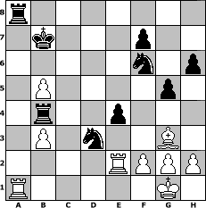 game notation in PGN-format [Event "Sweschnikow II"] [Site "www.myChess.de"] [Date "2012.04.28"] [Round "1"] [White "reisinger"] [Black "brucybabe"] [ECO "B33"] [WhitemyELO "1454"] [BlackmyELO "1649"] [Result "0-1"] [TimeControl "10/1728000"] [WhiteDays "20"] [BlackDays "20"] [MyChessNo "81301"] 1. e4 c5 2. Nf3 Nc6 3. d4 cxd4 4. Nxd4 Nf6 5. Nc3 e5 6. Ndb5 d6 7. Bg5 a6 8. Na3 b5 9. Nd5 Be7 10. Nxe7 Qxe7 11. Bd3 Be6 12. c3 d5 13. exd5 Bxd5 14. O-O O-O-O 15. Re1 h6 16. Be3 e4 17. Bxb5 axb5 18. Nxb5 Bc4 19. Qa4 Bxb5 20. Qxb5 Qb7 21. Qf5+ Kb8 22. Bf4+ Ka8 23. b4 Rd5 24. Qh3 Qd7 25. Qe3 g5 26. Bg3 Re8 27. c4 Rd4 28. b5 Ne5 29. Qa3+ Qa7 30. Qc3 Rxc4 31. Qb3 Qc5 32. Rad1 Nd3 33. Re3 Qb4 34. Rb1 Qxb3 35. axb3 Rb4 36. Ra1+ Kb7 37. Re2 Ra8 0-1 position notation in FEN-format r7/1k3p2/5n1p/1P4p1/1r2p3/1P1n2B1/4RPPP/R5K1 - - - 5 38 Captured white pieces: Captured black pieces: Click on a captured piece in order to display the desired move!