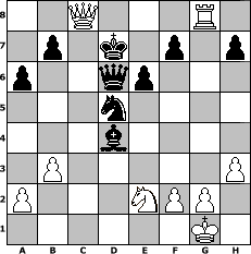 game notation in PGN-format [Event "Einer wird gewinnen !!!"] [Site "www.myChess.de"] [Date "2017.09.28"] [Round "1"] [White "Andylein1989"] [Black "kalle"] [ECO "B07"] [WhitemyELO "1664"] [BlackmyELO "1636"] [Result "1-0"] [TimeControl "10/1728000"] [WhiteDays "19"] [BlackDays "19"] [MyChessNo "109739"] 1. e4 d6 2. Nf3 g6 3. d4 Bg7 4. c3 Bg4 5. h3 Bd7 6. Bd3 c5 7. Nbd2 cxd4 8. cxd4 Nf6 9. Nf1 O-O 10. Ng3 a6 11. O-O e6 12. Bg5 Qb6 13. Rb1 Bb5 14. Re1 Nbd7 15. Qb3 Bxd3 16. Qxd3 Rac8 17. b3 Rc7 18. Bf4 Rfc8 19. Re2 Rc3 20. Qd1 Qc7 21. e5 dxe5 22. Nxe5 Nd5 23. Nxg6 Nxf4 24. Ne7+ Kf8 25. Nxc8 Nxe2+ 26. Nxe2 Rc6 27. Na7 Rb6 28. Rc1 Qd6 29. Nc8 Qb4 30. Nxb6 Nxb6 31. Rc7 Nd5 32. Rc4 Qd6 33. Rc8+ Ke7 34. Qc1 Kd7 35. Rg8 Bxd4 36. Qc8+ 1-0 position notation in FEN-format 2Q3R1/1p1k1p1p/p2qp3/3n4/3b4/1P5P/P3NPP1/6K1 - - - 1 36 Captured white pieces: ![]() ![]() ![]() ![]() ![]() ![]() ![]() ![]() ![]() ![]() ![]() ![]() ![]() ![]() ![]() Captured black pieces: ![]() ![]() ![]() ![]() ![]() ![]() ![]() ![]() ![]() ![]() ![]() ![]() ![]() ![]() ![]() Click on a captured piece in order to display the desired move!