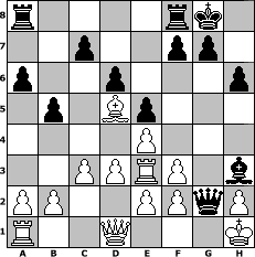game notation in PGN-format [Event "Dabei ist alles 2"] [Site "www.myChess.de"] [Date "2008.04.04"] [Round "1"] [White "Steppenwolf"] [Black "Andylein1989"] [ECO "C48"] [WhitemyELO "1435"] [BlackmyELO "1411"] [Result "0-1"] [TimeControl "10/864000"] [WhiteDays "09"] [BlackDays "06"] [MyChessNo "44047"] 1. e4 e5 2. Nf3 Nc6 3. Nc3 Nf6 4. Bb5 a6 5. Ba4 b5 6. Bb3 h6 7. d3 Bc5 8. O-O O-O 9. Re1 d6 10. Be3 Bxe3 11. Rxe3 Bg4 12. Nd5 Nd4 13. Nxf6+ Qxf6 14. c3 Nxf3+ 15. gxf3 Bh3 16. Bd5 Qg5+ 17. Kh1 Qg2# 0-1 position notation in FEN-format r4rk1/2p2pp1/p2p3p/1p1Bp3/4P3/2PPRP1b/PP2PPqP/R2Q3K - - - 5 18 Captured white pieces: Captured black pieces: Click on a captured piece in order to display the desired move!