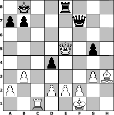 game notation in PGN-format [Event "mySchach Herbst-Open 2009"] [Site "www.myChess.de"] [Date "2009.09.25"] [Round "1"] [White "deepsabel"] [Black "espero"] [ECO "A81"] [WhitemyELO "1972"] [BlackmyELO "1717"] [Result "1-0"] [TimeControl "10/2592000"] [WhiteDays "30"] [BlackDays "28"] [MyChessNo "59261"] 1. d4 f5 2. g3 Nf6 3. Bg2 g6 4. Nh3 Bg7 5. Nf4 Nc6 6. h4 e5 7. dxe5 Nxe5 8. h5 c6 9. c4 Qe7 10. Nc3 d6 11. Qc2 Bd7 12. hxg6 hxg6 13. Rxh8+ Bxh8 14. b3 O-O-O 15. Bb2 g5 16. Nh3 Ne4 17. Nxe4 fxe4 18. Qxe4 d5 19. cxd5 cxd5 20. Rc1+ Kb8 21. Bxe5+ Bxe5 22. Qe3 Bxh3 23. Bxh3 d4 24. Qe4 Re8 25. Kf1 Qf7 26. Qxe5+ 1-0 position notation in FEN-format 1k2r3/pp3q2/8/4Q1p1/3p4/1P4PB/P2PPP2/2R2K2 - - - 0 26 Captured white pieces: Captured black pieces: Click on a captured piece in order to display the desired move!