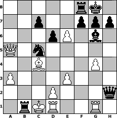 game notation in PGN-format [Event "Spa"] [Site "www.myChess.de"] [Date "2009.07.08"] [Round "1"] [White "Hobbykegler"] [Black "Steppenwolf"] [ECO "A20"] [WhitemyELO "1042"] [BlackmyELO "1210"] [Result "0-1"] [TimeControl "10/2592000"] [WhiteDays "27"] [BlackDays "28"] [MyChessNo "57258"] 1. c4 e5 2. b3 Nc6 3. Bb2 Nf6 4. Qc2 Bb4 5. a3 Ba5 6. b4 Bb6 7. Nc3 a5 8. bxa5 Bxa5 9. O-O-O O-O 10. e3 d6 11. Nd5 Bg4 12. f3 Bh5 13. g4 Bg6 14. Qb3 Nxd5 15. cxd5 Ne7 16. Qxb7 Rb8 17. Qa6 Bb6 18. f4 Nxd5 19. fxe5 Qd7 20. Nf3 Qc6+ 21. Bc3 Nxc3 22. Re1 Qxf3 23. Rg1 Qf2 24. Bc4 Ne4 25. Rd1 Qxh2 26. e6 Nc5 27. Qb5 Ba5 28. Qxa5 Rb1# 0-1 position notation in FEN-format 5rk1/2p2ppp/3pP1b1/Q1n5/2B3P1/P3P3/3P3q/1rKR2R1 - - - 1 29 Captured white pieces: Captured black pieces: Click on a captured piece in order to display the desired move!