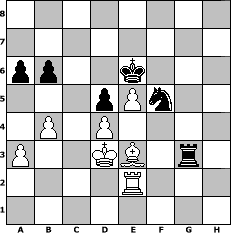 game notation in PGN-format [Event "André Chéron - 30. Todestag"] [Site "www.myChess.de"] [Date "2010.09.12"] [Round "1"] [White "Joschi"] [Black "sprinterde"] [ECO "C01"] [WhitemyELO "1626"] [BlackmyELO "1506"] [Result "1/2-1/2"] [TimeControl "10/1728000"] [WhiteDays "133"] [BlackDays "137"] [MyChessNo "68254"] 1. e4 e6 2. d4 Qh4 3. Bd3 Nf6 4. Nc3 Bb4 5. Nf3 Qh5 6. Bd2 O-O 7. a3 Bxc3 8. Bxc3 d5 9. e5 Ne4 10. Bb4 Re8 11. O-O Nc6 12. Be1 Ng5 13. Nxg5 Qxg5 14. c3 a6 15. Bd2 Qh4 16. g3 Qh3 17. Re1 Bd7 18. Bf1 Qf5 19. Re3 Nd8 20. Bd3 Qh3 21. Bf1 Qf5 22. Bd3 Qg5 23. Re1 Qe7 24. Qh5 g6 25. Qg4 h5 26. Qf3 c5 27. h4 Nc6 28. Bg5 Qf8 29. Qf4 cxd4 30. cxd4 Rec8 31. Bh6 Qd8 32. Re3 Rcb8 33. Rf3 Qe7 34. Bg5 Qe8 35. Bh6 Qe7 36. Rd1 Rc8 37. Bb1 Na7 38. g4 Ba4 39. Re1 hxg4 40. Qxg4 Bc2 41. h5 Bf5 42. Bxf5 exf5 43. Rxf5 Rc6 44. hxg6 Rxg6 45. Rg5 Qe6 46. Rxg6+ Qxg6 47. Qxg6+ fxg6 48. Be3 Kf7 49. Rc1 Nc6 50. Kg2 Rh8 51. Kg3 Ke6 52. Kg4 Rh5 53. Rg1 Ne7 54. Rc1 Kd7 55. Rc5 b6 56. Rc1 Nf5 57. Rc2 Rh2 58. Kf3 Rh3+ 59. Ke2 g5 60. Rc1 g4 61. Rg1 g3 62. fxg3 Nxg3+ 63. Kd2 Ne4+ 64. Kd3 Ng3 65. b4 Nf5 66. Re1 Ke6 67. Re2 Rg3 1/2-1/2 position notation in FEN-format 8/8/pp2k3/3pPn2/1P1P4/P2KB1r1/4R3/8 - - - 5 68 Captured white pieces: Captured black pieces: Click on a captured piece in order to display the desired move!