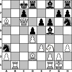game notation in PGN-format [Event "Novembernebel"] [Site "www.myChess.de"] [Date "2014.10.16"] [Round "2"] [White "hape50"] [Black "Hobbykegler"] [ECO "D00"] [WhitemyELO "1346"] [BlackmyELO "1097"] [Result "1-0"] [TimeControl "10/2592000"] [WhiteDays "30"] [BlackDays "30"] [MyChessNo "96392"] 1. d4 d5 2. e3 Nc6 3. h3 Qd6 4. Nf3 Bf5 5. Be2 Nb4 6. Na3 O-O-O 7. c3 Nc6 8. Ng5 Nh6 9. O-O f6 10. Nf3 a5 11. Nb5 Qd7 12. b4 axb4 13. cxb4 Nxb4 14. Qb3 e6 15. Bd2 Nc2 16. Qa4 Qc6 17. Na7+ Kb8 18. Nxc6+ bxc6 19. Rab1+ Kc8 20. Qxc6 Na3 21. Ba6# 1-0 position notation in FEN-format 2kr1b1r/2p3pp/B1Q1pp1n/3p1b2/3P4/n3PN1P/P2B1PP1/1R3RK1 - - - 2 21 Captured white pieces: Captured black pieces: Click on a captured piece in order to display the desired move!