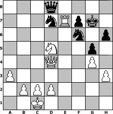 game notation in PGN-format [Event "Schon wieder."] [Site "www.myChess.de"] [Date "2017.10.12"] [Round "1"] [White "Winston"] [Black "Knight"] [ECO "D00"] [WhitemyELO "1443"] [BlackmyELO "1133"] [Result "1-0"] [TimeControl "10/2592000"] [WhiteDays "119"] [BlackDays "120"] [MyChessNo "109906"] 1. d4 d5 2. e4 dxe4 3. Nc3 Nf6 4. f3 exf3 5. Qxf3 c6 6. Be3 e6 7. a3 Bd6 8. O-O-O O-O 9. h3 Re8 10. Bd3 e5 11. dxe5 Bxe5 12. Nge2 b5 13. Nxb5 Qe7 14. Nxa7 Rxa7 15. Bxa7 Nbd7 16. Qxc6 Qd8 17. Qf3 Qa5 18. Bd4 h6 19. Bc3 Bxc3 20. Nxc3 Ne5 21. Qf1 Be6 22. g4 Rd8 23. Be2 Rxd1+ 24. Qxd1 Bc4 25. Re1 Bxe2 26. Rxe2 Kh7 27. Qf1 Ned7 28. Qg2 g5 29. Re7 Kg7 30. Qf2 Qc7 31. Qd4 Qd8 32. Nd5 1-0 position notation in FEN-format 3q4/3nRpk1/5n1p/3N2p1/3Q2P1/P6P/1PPP4/2K5 - - - 7 32 Captured white pieces: Captured black pieces: Click on a captured piece in order to display the desired move!