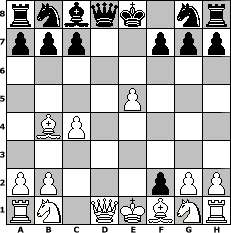 | game notation in PGN-format [Event "Schach f"] [Site "www.myChess.de"] [Date "2008.11.01"] [Round "1"] [Board "2"] [White "Seneca"] [Black "Papale"] [ECO "D08"] [WhitemyELO "1457"] [BlackmyELO "1778"] [Result "0-1"] [TimeControl "10/2592000"] [WhiteDays "23"] [BlackDays "28"] [MyChessNo "49330"] 1. d4 d5 2. c4 e5 3. dxe5 d4 4. e3 Bb4+ 5. Bd2 dxe3 6. Bxb4 exf2+ 0-1 position notation in FEN-format rnbqk1nr/ppp2ppp/8/4P3/1BP5/8/PP3pPP/RN1QKBNR - KQkq - 0 7 Captured white pieces:                              Captured black pieces:                               Click on a captured piece in order to display the desired move!