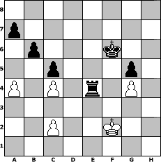 game notation in PGN-format [Event "Schach im Mittelalter: Tugend der Ritter"] [Site "www.myChess.de"] [Date "2016.12.17"] [Round "1"] [White "martinus"] [Black "deepsabel"] [ECO "D02"] [WhitemyELO "1762"] [BlackmyELO "2025"] [Result "0-1"] [TimeControl "10/2592000"] [WhiteDays "119"] [BlackDays "120"] [MyChessNo "106043"] 1. d4 d5 2. Nf3 Nf6 3. Bf4 e6 4. Nc3 Bb4 5. g3 O-O 6. Bg2 Ne4 7. Qd3 Bxc3+ 8. bxc3 c5 9. O-O b6 10. Nd2 Ba6 11. Qe3 Nd6 12. Nf3 Nf5 13. Qd2 Nc6 14. e3 Bxf1 15. Bxf1 Qe7 16. Ne5 Nxe5 17. Bxe5 Nd6 18. Bg2 Nc4 19. Qe2 Nxe5 20. dxe5 Rac8 21. f4 f6 22. e4 fxe5 23. exd5 exd5 24. Bxd5+ Kh8 25. fxe5 Rf5 26. Re1 Re8 27. c4 Rxe5 28. Qxe5 Qxe5 29. Rxe5 Rxe5 30. Kf2 g6 31. a4 Kg7 32. Kf3 Kf6 33. g4 Re1 34. h4 h6 35. Be4 g5 36. hxg5+ hxg5 37. Kf2 Rxe4 0-1 position notation in FEN-format 8/p7/1p3k2/2p3p1/P1P1r1P1/8/2P2K2/8 - - - 0 38 Captured white pieces: Captured black pieces: Click on a captured piece in order to display the desired move!