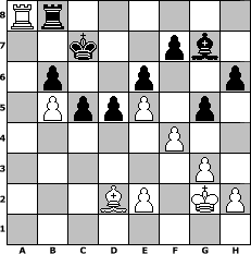 game notation in PGN-format [Event "> 1500"] [Site "www.myChess.de"] [Date "2010.03.18"] [Round "1"] [White "rux"] [Black "Winston"] [ECO "A06"] [WhitemyELO "1460"] [BlackmyELO "1389"] [Result "1/2-1/2"] [TimeControl "10/2592000"] [WhiteDays "119"] [BlackDays "120"] [MyChessNo "64060"] 1. Nf3 d5 2. d4 Nf6 3. g3 Nc6 4. Ne5 Nxe5 5. dxe5 Ne4 6. Bg2 Bf5 7. O-O Qd7 8. Bxe4 Bxe4 9. f3 Bg6 10. Qd4 Bxc2 11. Nc3 e6 12. a3 Bb3 13. Re1 Qc6 14. Qg4 Qc5+ 15. Kg2 O-O-O 16. Bg5 Rd7 17. Rac1 Qb6 18. Bd2 c6 19. Qf4 h6 20. Na4 Bxa4 21. Qxa4 a6 22. b4 Qb5 23. Qxb5 axb5 24. a4 bxa4 25. b5 c5 26. Ra1 b6 27. Rxa4 Rb7 28. Rea1 g5 29. Ra8+ Kc7 30. R1a7 Bg7 31. f4 Rxa8 32. Rxa8 Rb8 33. Ra7+ Rb7 34. Ra8 Rb8 35. Ra7+ Rb7 36. Ra8 Rb8 1/2-1/2 position notation in FEN-format Rr6/2k2pb1/1p2p2p/1PppP1p1/5P2/6P1/3BP1KP/8 - - - 9 37 Captured white pieces: Captured black pieces: Click on a captured piece in order to display the desired move!