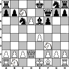game notation in PGN-format [Event "Herbst 2024"] [Site "www.myChess.de"] [Date "2024.11.17"] [Round "1"] [White "spiderman"] [Black "skuehnel"] [ECO "A00"] [WhitemyELO "1849"] [BlackmyELO "1324"] [Result "1-0"] [TimeControl "10/2592000"] [WhiteDays "40"] [BlackDays "50"] [MyChessNo "132566"] 1. Nc3 e5 2. Nf3 Nc6 3. d4 f6 4. dxe5 Bb4 5. e4 Qe7 6. Bd2 d6 7. Nd5 Bxd2+ 8. Qxd2 Qf7 9. exd6 Be6 10. Nxc7+ 1-0 position notation in FEN-format r3k1nr/ppN2qpp/2nPbp2/8/4P3/5N2/PPPQ1PPP/RN2KB1R - KQkq - 0 10 Captured white pieces: Captured black pieces: Click on a captured piece in order to display the desired move!