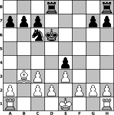 game notation in PGN-format [Event "Ranglistenturnier 1400-1800 myELO"] [Site "www.myChess.de"] [Date "2007.01.22"] [Round "2"] [White "Chelly"] [Black "Zargoz"] [ECO "D02"] [WhitemyELO "1673"] [BlackmyELO "1506"] [Result "1/2-1/2"] [TimeControl "10/3456000"] [WhiteDays "66"] [BlackDays "11"] [MyChessNo "31933"] 1. d4 d5 2. Nf3 Nc6 3. Bf4 f6 4. e3 Bg4 5. Be2 Bxf3 6. Bxf3 e5 7. dxe5 fxe5 8. Bg3 e4 9. Bg4 Nf6 10. Be6 Bd6 11. Bh4 Be7 12. Nc3 Qd6 13. Bxf6 Bxf6 14. Qxd5 Bxc3+ 15. bxc3 Ke7 16. Qxd6+ Kxd6 17. Bb3 Rad8 1/2-1/2 position notation in FEN-format 3r3r/ppp3pp/2nk4/8/4p3/1BP1P3/P1PP1PPP/R3K2R - KQ - 2 18 Captured white pieces: Captured black pieces: Click on a captured piece in order to display the desired move!