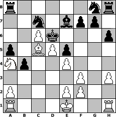game notation in PGN-format [Event "Veni Vidi Vici"] [Site "www.myChess.de"] [Date "2023.11.13"] [Round "1"] [White "Achimkogge"] [Black "borsti"] [ECO "C41"] [WhitemyELO "1289"] [BlackmyELO "1274"] [Result "1-0"] [TimeControl "10/864000"] [WhiteDays "10"] [BlackDays "10"] [MyChessNo "131039"] 1. e4 e5 2. Nf3 d6 3. d4 Bg4 4. Bb5+ c6 5. h3 Bxf3 6. Bxc6+ Nxc6 7. gxf3 h6 8. d5 Nd4 9. c3 Nb5 10. Qa4 a6 11. Be3 Qd7 12. c4 Nc7 13. Qxd7+ Kxd7 14. b4 b5 15. c5 dxc5 16. bxc5 a5 17. c6+ Kd6 18. Nc3 b4 19. Na4 Be7 20. Bc5# 1-0 position notation in FEN-format r5nr/2n1bpp1/2Pk3p/p1BPp3/Np2P3/5P1P/P3PP2/R3K2R - KQ - 3 20 Captured white pieces: ![]() ![]() ![]() ![]() ![]() ![]() ![]() ![]() ![]() ![]() ![]() ![]() ![]() ![]() ![]() Captured black pieces: ![]() ![]() ![]() ![]() ![]() ![]() ![]() ![]() ![]() ![]() ![]() ![]() ![]() ![]() ![]() Click on a captured piece in order to display the desired move!
