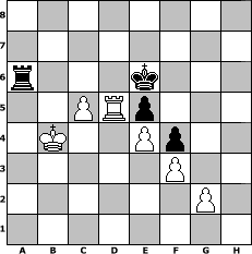 game notation in PGN-format [Event "Schach bei einem Schoppen Wein"] [Site "www.myChess.de"] [Date "2012.02.06"] [Round "1"] [White "Erich"] [Black "Grubengeist"] [ECO "B08"] [WhitemyELO "2004"] [BlackmyELO "1853"] [Result "1-0"] [TimeControl "10/1728000"] [WhiteDays "20"] [BlackDays "20"] [MyChessNo "79740"] 1. e4 d6 2. d4 Nf6 3. Nc3 g6 4. Nf3 Bg7 5. Be2 O-O 6. O-O c6 7. Be3 Nbd7 8. a4 e5 9. dxe5 Nxe5 10. Nxe5 dxe5 11. Qxd8 Rxd8 12. Bc4 b6 13. f3 Bb7 14. Rfd1 h5 15. Rxd8+ Rxd8 16. a5 Nd7 17. b4 Bf8 18. axb6 Nxb6 19. Bxf7+ Kxf7 20. Rxa7 Rd7 21. Bxb6 Bxb4 22. Na2 Bd2 23. Kf2 Ke6 24. Be3 c5 25. Bxc5 Rc7 26. Ke2 Bf4 27. Nb4 Rxc5 28. Rxb7 Bxh2 29. Kd3 h4 30. Nd5 g5 31. Re7+ Kd6 32. Rg7 Bf4 33. Rg6+ Kd7 34. Nxf4 gxf4 35. Rh6 Rc8 36. Rxh4 Kd6 37. Rh6+ Ke7 38. Rg6 Kf7 39. Rd6 Rh8 40. c4 Rh1 41. Kc3 Rc1+ 42. Kb3 Rb1+ 43. Kc2 Ra1 44. c5 Ke7 45. Kb2 Ra5 46. Rd5 Ke6 47. Kb3 Ra6 48. Kb4 1-0 position notation in FEN-format 8/8/r3k3/2PRp3/1K2Pp2/5P2/6P1/8 - - - 8 48 Captured white pieces: Captured black pieces: Click on a captured piece in order to display the desired move!
