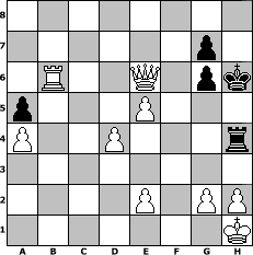 game notation in PGN-format [Event "Sommerturnier myElo 1500 und niedriger"] [Site "www.myChess.de"] [Date "2009.08.07"] [Round "1"] [White "alpacino"] [Black "Ostseeboy"] [ECO "B23"] [WhitemyELO "1322"] [BlackmyELO "1262"] [Result "1-0"] [TimeControl "10/3456000"] [WhiteDays "190"] [BlackDays "199"] [MyChessNo "58104"] 1. e4 c5 2. Nc3 e6 3. Nf3 Nf6 4. Bc4 Be7 5. O-O O-O 6. d3 Nc6 7. Be3 Ng4 8. Bd2 Nd4 9. Nxd4 cxd4 10. Nb5 a6 11. Nxd4 Nf6 12. Bc3 b5 13. Bb3 Bb7 14. Qe1 b4 15. Bd2 Bc5 16. Nf3 h6 17. c3 bxc3 18. Bxc3 Qb6 19. d4 Be7 20. Ne5 Nxe4 21. Rc1 Nxc3 22. bxc3 Rad8 23. Nc4 Qc6 24. f3 Bg5 25. Ne5 Qb5 26. c4 Qb6 27. c5 Qb5 28. f4 Bf6 29. Kh1 a5 30. Rb1 Bxe5 31. fxe5 Qd3 32. Rd1 Qg6 33. Rf2 Ra8 34. a4 h5 35. Bc2 h4 36. Bxg6 fxg6 37. Rxf8+ Rxf8 38. Qxh4 Rf5 39. Rb1 Rh5 40. Qd8+ Kh7 41. Qxd7 Bd5 42. c6 Bxc6 43. Qxc6 Kh6 44. Qxe6 Rh4 45. Rb6 1-0 position notation in FEN-format 8/6p1/1R2Q1pk/p3P3/P2P3r/8/4P1PP/7K - - - 2 45 Captured white pieces: Captured black pieces: Click on a captured piece in order to display the desired move!